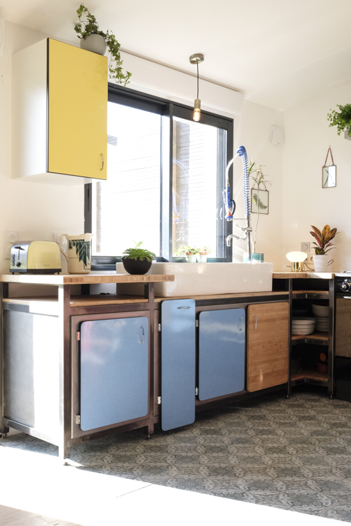 Image précédente Image suivante DSCF8998 cuisine en structure acier / Portes en formica / plan de travail et tablettes en bambou.