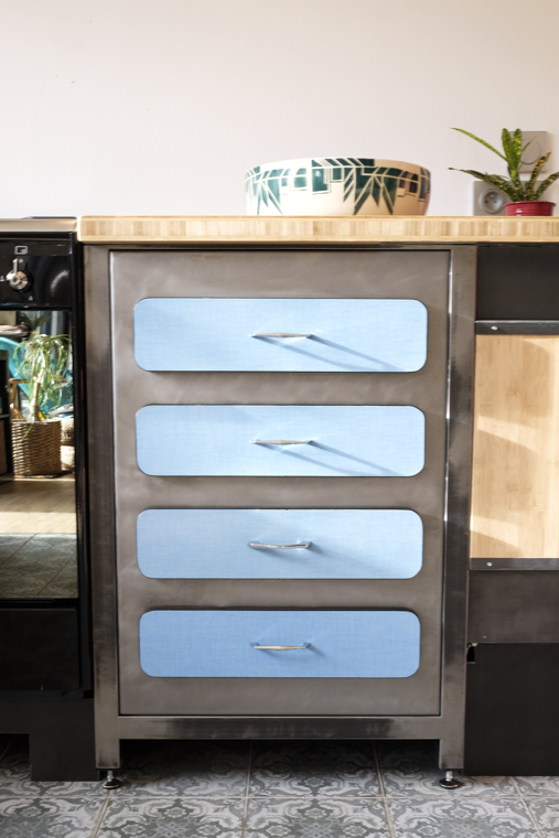 Image précédente Image suivante DSCF9025 meuble métal acier brut vernis et portes tiroirs en formica.