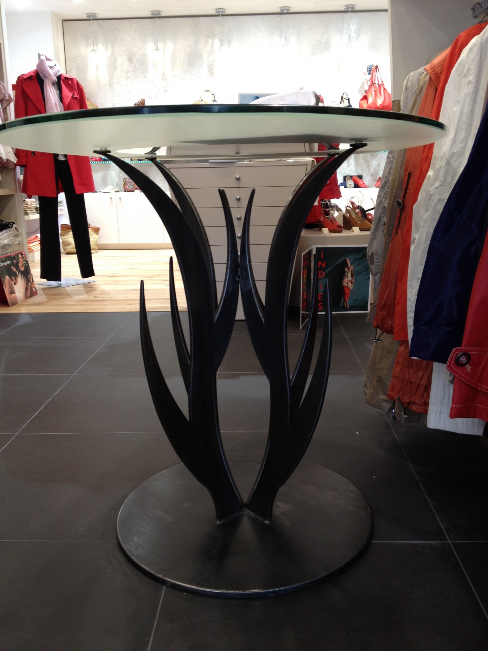Table présentoir – piétement acier et plateau verre poli.